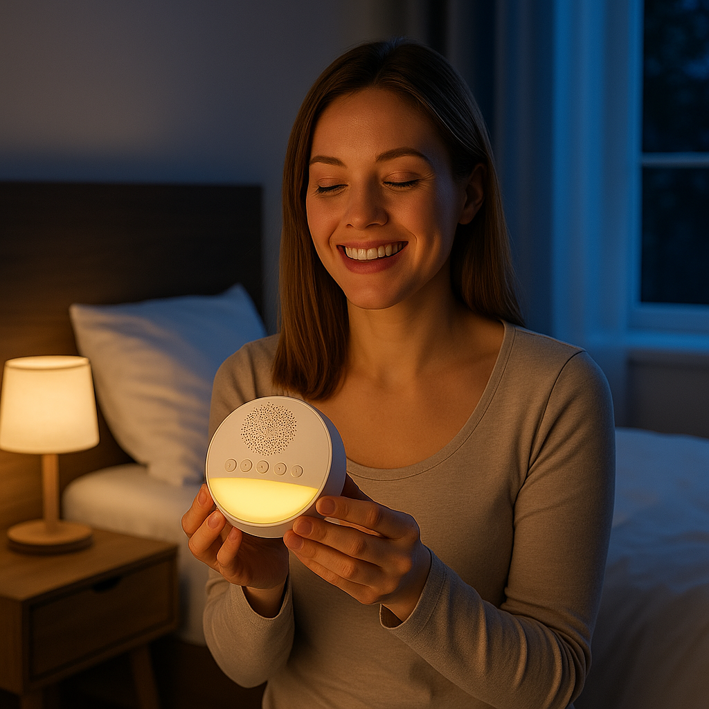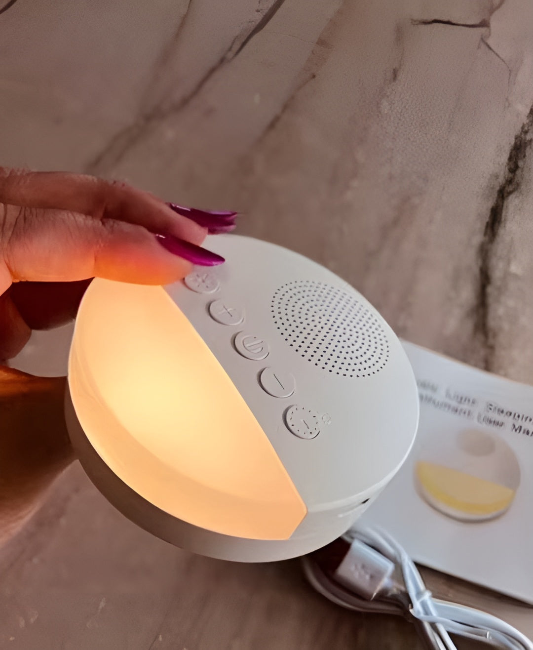 You stare at the clock, 3:12 a.m. again. The room is quiet, but your mind isn’t. You tap the white noise on, a soft glow fills the night, and the steady hum nudges your thoughts to drift. Eyes close. Morning feels possible.